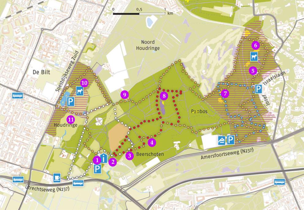 Parkbos, stuifduinen, weiden met boomgroepen en oude lanen wisselen elkaar af. U vindt hier vier gemarkeerde wandelroutes: rood (4,5 km), wit (3,5 km), geel (12 km) en blauw (3,5 km): wandelroutes Panbos, Beerschoten en Houdringe